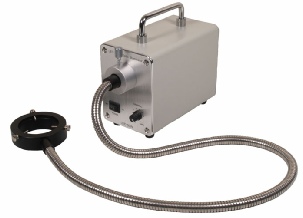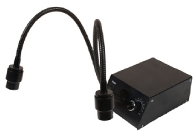Fibre optic light units are still the best way to get high intensity illumination. This is an LED unit which delivers light intensity far greater that the standard halogen systems The light emission here is better than the equivalent halogen system of 150 watts. The power source has an on/off switch with rheostat control house within a compact all metal alloy body. The ring light will fit any stereomicroscope where the cowling of the stereo head is less than 60mm in diameter. Condition as new and guaranteed.