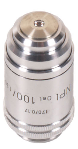 An excellent NPLx100 oil immersion Leitz objective with standard RMS screw threat. Numerical aperture 1.30 and corrected for 170mm tube length and 0.17mm coverslip thickness.