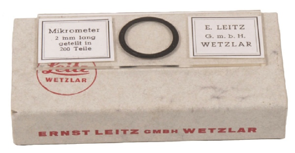 An original Leitz stage micrometer with a scale that is 2mm divided into 200 divisions. Not only does it have the original German labels on the slide but it is complete with its original box.