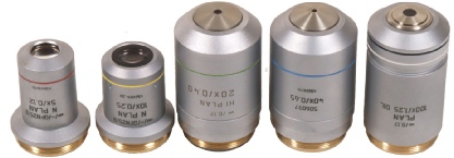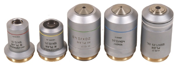 170mm all original Leitz objectives x2.5 (0.07), NPL x10 (1.25), x40 (0.65), x100 oil immersion (1.25). The turret has spaces for five objectives and a blank is in the vacant place. A part of Leitz history that gives an excellent optical performance.