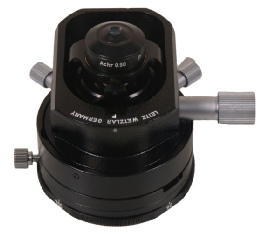The turret has five Plan Fluotar Leitz objectives with particularly good numerical apertures x10 (0.30), x16 (0.40), x40 (0.70), x50 oil immersion (1.00) and x100 oil immersion (1.32). The eyepieces are Periplan x10 wide field that are suitable for spectacle wearers.