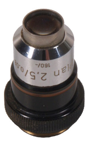 The name Zeiss needs no introduction and the quality of microscope objectives shows at very high power and also low power magnifications, simply because producing the right curvature lenses for both extremes is where the skill comes in . This is a x2.5 plan achromatic objective with a numerical aperture of 0.06, corrected for 160mm tube length with an RMS screw thread. A very good lens