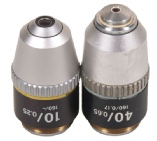 This is a pair of Nikon achromatic objectives x10 and x40 with numerical apertures of 0.25 and 0.65. Corrected for 160mm and with standard RMS screw threads.The x40 is spring loaded. In very good condition.