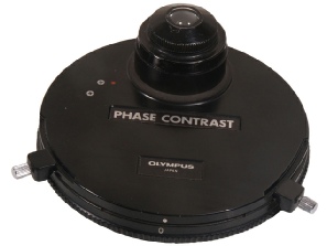 A phase contrast condenser for the CH or BH Olympus microscope. Zernike pattern with bright field position and phase rings for x10, x20, x40 and x100 objectives. The phase rings have centring adjusters. Condition good.
