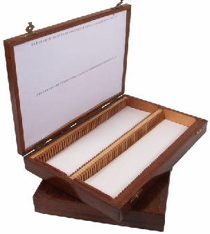 This is a pair of wooden, stained and varnished slide boxes. Each will hold 100 slides on edge and the lid contains and index sheet. Each slide position is numbered condition excellent.