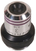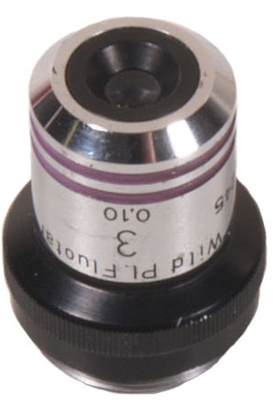 Wild made quite a range of magnifications in their objectives. This is quite a rare example of x3 Plan Fluotar with a numerical aperture of 0.1. Standard RMS screw thread and corrected for 160mm tube length. Good condition.
