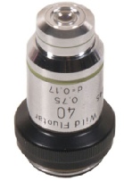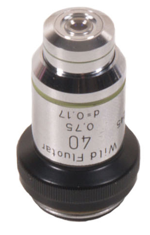 A Wild objective in very good condition. x40 fluotar with an exceptional numerical aperture of 0.75. Standard RMS screw thread and corrected for 160mm tube length and corrected for 0.17mm coverslip thickness.