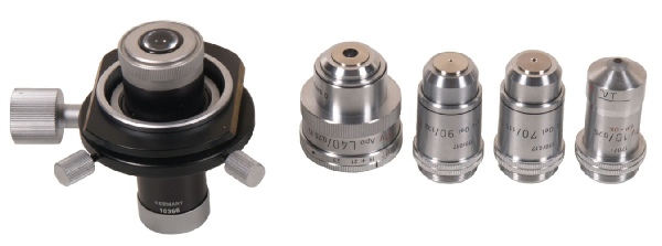 170mm all original Leitz objectives x2.5 (0.07), NPL x10 (1.25), x40 (0.65), x100 oil immersion (1.25). The turret has spaces for five objectives and a blank is in the vacant place. A part of Leitz history that gives an excellent optical performance.