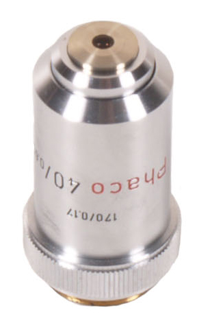 An excellent x40 phase contrast Phaco Leitz objective with standard RMS screw threat. Numerical aperture 0.65 and corrected for 170mm tube length and 0.17mm coverslip thickness.