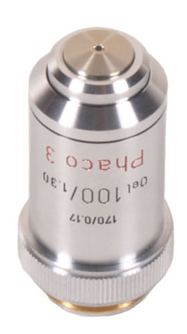 An excellent x100 phase contrast oil immersion Phaco 3 Leitz objective with standard RMS screw threat. Numerical aperture 1.30 and corrected for 170mm tube length and 0.17mm coverslip thickness.