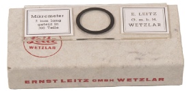 An original Leitz stage micrometer with a scale that is 2mm divided into 200 divisions. Not only does it have the original German labels on the slide but it is complete with its original box.