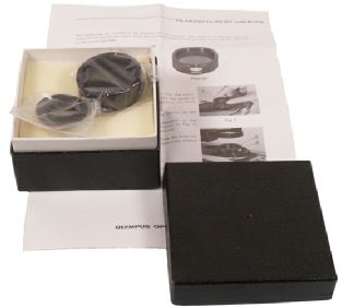 In really excellent condition this is a pair of polariser/analyser filters for the Olympus BH microscope. The analyser fits under the head and the polariser over the light source. It is complete with the original instructions and case,