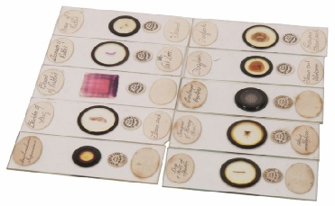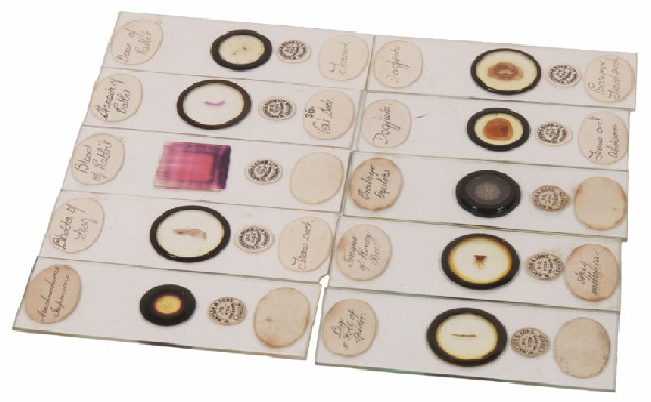 Watson and Sons have been associated with the manufacture or microscopes and all the accessories and support materials since Victorian times being first established in 1837. They continued to make microscope until the end of the 1960’s, but never resumed slide preparation after the second world war. It is possible to date their products from their exact company name and the address at the time. These ten slides date from before 1908. They have the classic small circular logo and are otherwise labelled with pen and ink. The specimens include dogfish, honeybee tongue, oyster embryo and parts of rabbit and frog. Well worth adding to any antique slide collection.