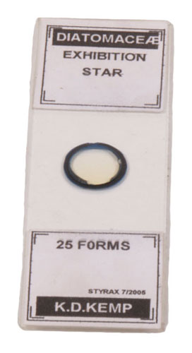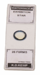 Klaus Kemp needs no introduction in the world of diatom recognition or slide preparation. His undoubted skill was the preparation of exhibition slides. These were slides that he had produced that had patterns made from individual diatoms. The mystery is how he managed to get the individual diatoms to stay in place while he positioned the next one. Sadly, Klaus is no longer with us, but the slides that he made are. This is one where the diatoms are arranged in a star formation. Although he would not have wanted it to be, these slides are now extremely valuable.