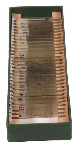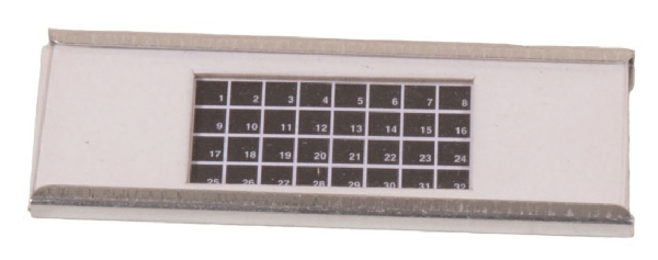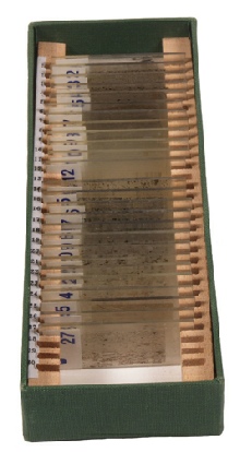 This is a set of 9 slide bases that have 32 individually numbered ‘boxes’ usually used for displaying microfossils. The base is covered by a standard sized slide