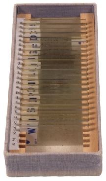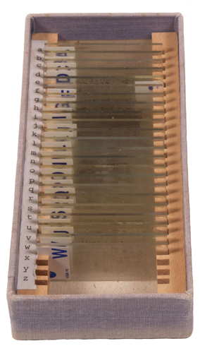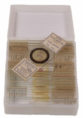 Biosil was a firm operated by John Wells in the 1960’s and was well known not only for the very wide range of specimen types but also their quality. This is a set of 18 slides of botanical material which includes West Indian wood, tea, pine cones male and female, sweet potato, several pollens and even coconut. Each labelled with the classic Biosil label produced on a typewriter!