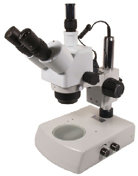 This trinocular zoom stereomicroscope was originally sold by our sister company Apex Microscopes. It has a continuous zoom magnification range of x10 to x40 and has extra wide field x10 eyepieces. This particular stereohead is mounted on stand that represents and upgrade from the standard unit. The good sized ‘tear drop’ shaped base has a pole stand for coarse height adjustment to suit the specimen being viewed. In addition the focus black has is own coaxial coarse and fine focus system. This is unusual in the budget end of the market.