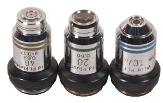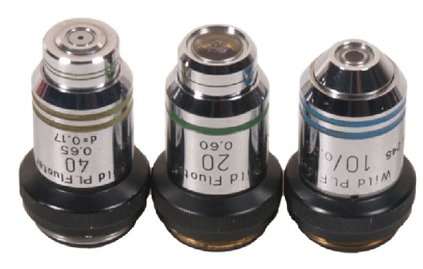 There can be little doubt that the Wild M20 was the iconic NHS pathology laboratory microscope through the 1970’s and 80’s. (Indeed, I used one myself!). This is a set of three objectives of good quality. x10 plan fluotar (0.25), x20 fluotar (0.60) and x40 plan fluotar (0.65) all with their original Wild objective pots. All corrected for 160mm tube length and 0.17mm coverslip thickness. Condition excellent and a bargain.